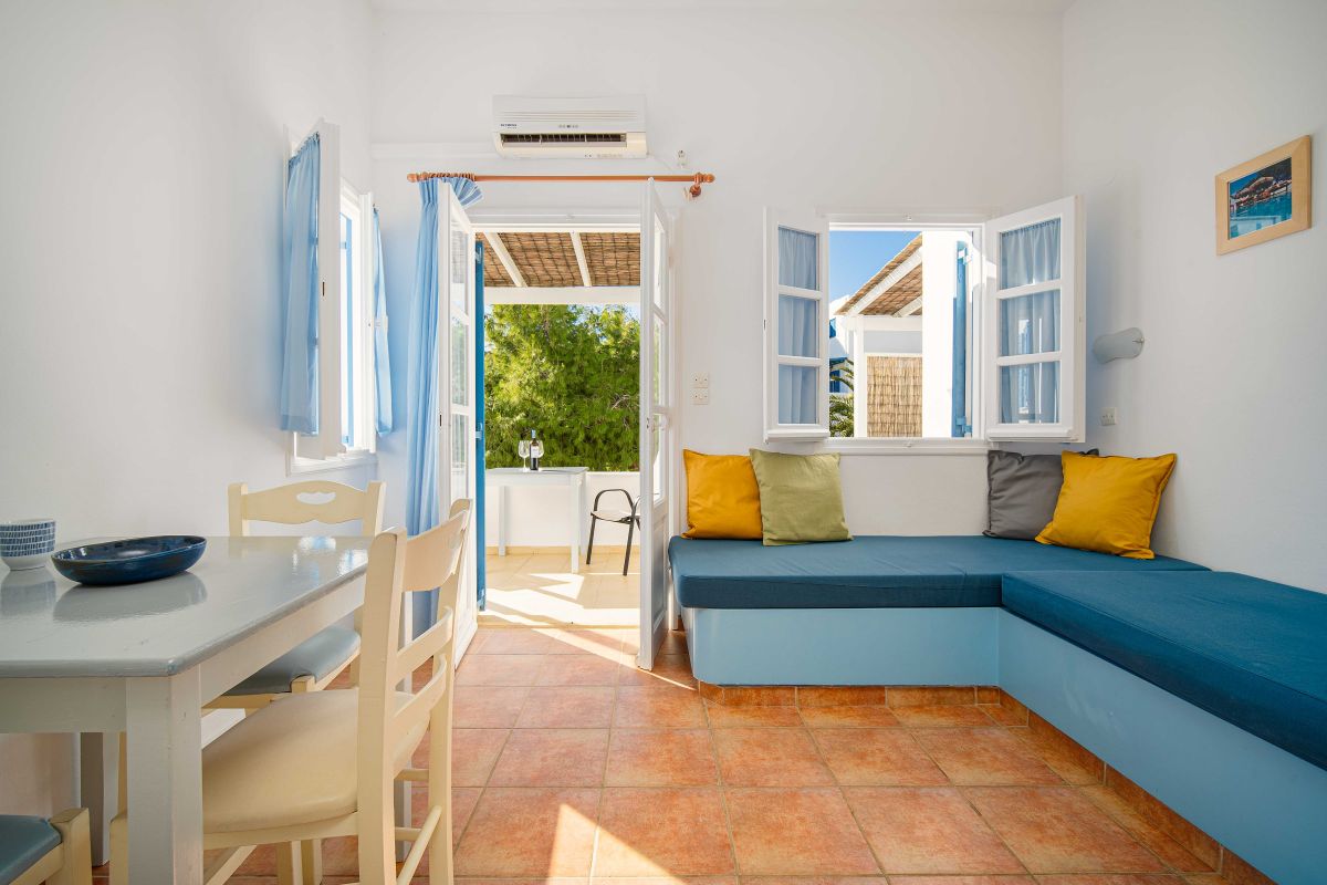 Garden View - Serifos Coralli Apartments & Studios -- Bedroom and living room with Kitchen A/C, TV.